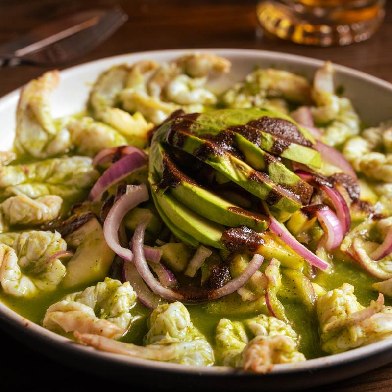 Shrimp cooked in lime juice in our special green and red sauce with a bed of red onions, and cucumber, topped with avocado