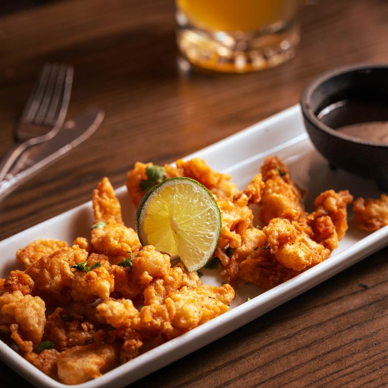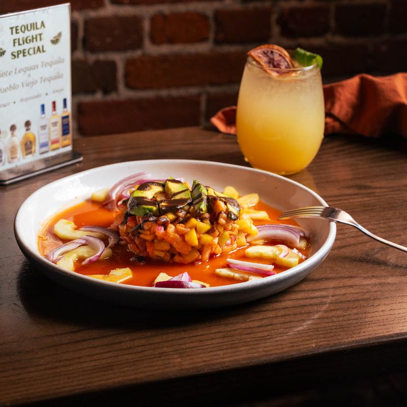 Shrimp cooked in lime juice with mango, onions, cilantro, tomato, in our special red sauce, topped with salsa negra drizzle and avocado side of tostada or crackers